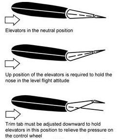 An upward deflection of the trim tab will force the elevator downward with the same result as moving the elevator downward with the elevator control, and conversely a downward deflection of the trim tab will force the elevator upward. The direction the trim tab is deflected will always cause the entire elevator to be deflected in the opposite direction. [Figure 1-26]