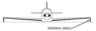 Dihedral is the angle at which the wings are slanted upward from the root to the tip. [Figure 1-27] The stabilizing effect of dihedral occurs when the airplane sideslips slightly as one wing is forced down in turbulent air. This sideslip results in a difference in the angle of attack between the higher and lower wing with the greatest angle of attack on the lower wing. The increased angle of attack produces increased lift on the lower wing with a tendency to return the airplane to wings-level flight. Note the direction of the relative wind during a slip by the arrows in figure 1-27. |