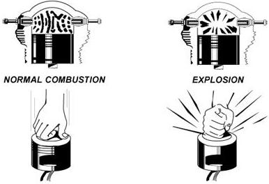 The proper fuel for an engine will burn smoothly from the spark plug outward, exerting a smooth pressure downward on the piston. Using low-grade fuel or too lean a mixture can cause detonation. Detonation or knock is a sudden explosion or shock, to a small area of the piston top, similar to striking it with a hammer. Detonation produces extreme heat which often progresses into preignition, causing structural stresses on parts of the engine. Therefore, to prevent detonation, the pilot should use the proper grade of fuel, maintain a sufficiently rich mixture, and maintain engine temperatures within the recommended limits. [Figure 2-9]