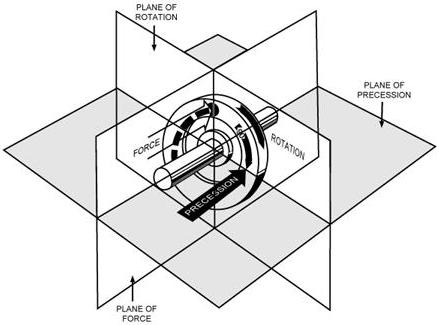 | Figure 3-6.—Precession of a gyroscope resulting from an applied deflective force. |