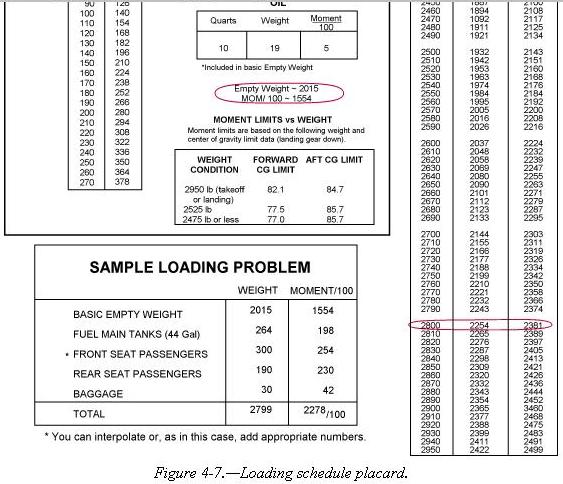 The table method applies the same principles as the computational and graph methods. The information and limitations are contained in tables provided by the manufacturer. Figure 4-7 is an example of a table and a weight and balance calculation based on that table. In this problem, the total weight of 2,799 pounds and moment of 2,278\100 is within the limits of the table.