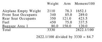 Step 2—Enter the moment for each item listed. Remember “weight x arm = moment.” To simplify calculations, the moments are divided by 100.
