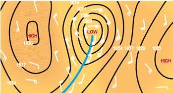 | Figure 5-24.—Weather map indication of wind shift line (center line leading to low). |