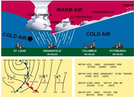 | Figure 5-23.—A cold front: (upper) cross section; (lower left) as shown on a weather map; (lower right) as shown in an aviation routine weather report (METAR). |