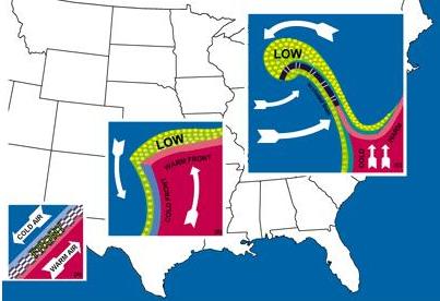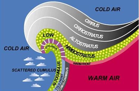 Unlike the warm front, the cold front rushes in almost unannounced,