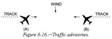 | ATC issues traffic information based on observed radar targets. The traffic is referenced by azimuth from the aircraft in terms of the 12-hour clock. Also the distance in nautical miles, direction in which the target is moving, and the type and altitude of the aircraft, if know, are given. An example would be: “Traffic 10 o’clock 5 miles east bound, Cessna 152, 3,000 feet.” The pilot should note that traffic position is based on the aircraft track, and that wind correction can affect the clock position at which a pilot locates traffic. [Figure 6-16] |