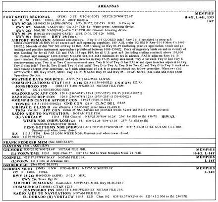 The Airport/Facility Directory provides the most comprehensive information on a given airport. It contains information on airports, heliports, and seaplane bases which are open to the public. The A/FD’s are contained in seven books which are organized by regions. These A/FD’s are revised every 8 weeks. Figure 6-2 contains an excerpt from a directory. For a complete listing of information provided in an A/FD and how the information may be decoded, a pilot should refer to the “Directory Legend Sample” located in the front of each A/FD.
