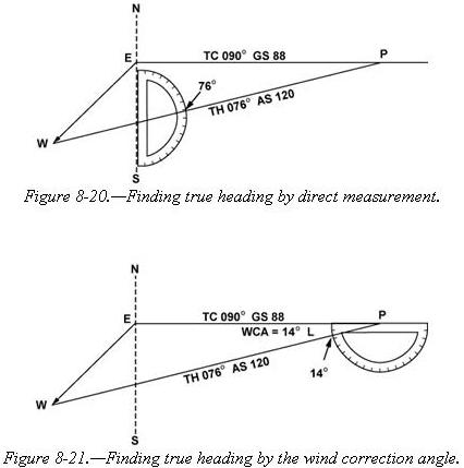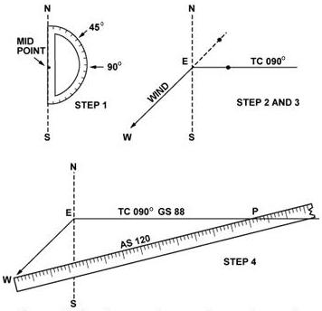 The true heading necessary to offset drift is indicated by the direction of the airspeed line which can be determined in one of two ways: • By placing the straight side of the protractor along the north-south