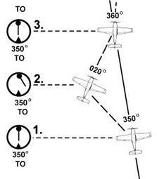 • To return to the desired radial, the aircraft heading must be altered approximately 30° to the right. As the aircraft returns to the desired track, the deviation needle will slowly return to center. When centered, the aircraft will be on the desired radial and a left turn must be made toward, but not to the original heading of 350° because a wind drift correction must be established. The amount of correction depends upon the strength of the wind. If the wind velocity is unknown, a trial and error method can be used to find the correct heading. Assume, for this example a 10° correction or a heading of 360° is maintained.