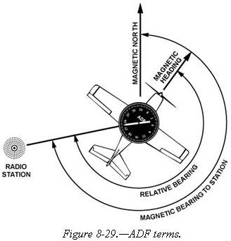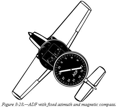 Basically, the ADF aircraft equipment consists of a tuner, which is used to set the desired station frequency, and the navigational display. The navigational display consists of a dial upon which the azimuth is printed, and a needle which rotates around the dial and points to the station to which the receiver is tuned. Some of the ADF dials can be rotated so as to align the azimuth with the aircraft heading, others are fixed with 0° representing the nose of the aircraft, and 180° representing the tail. Only the fixed azimuth dial will be discussed in this handbook. [Figure 8-28] |