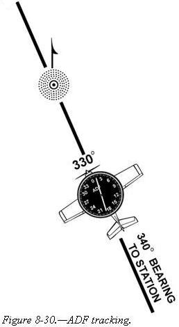 Keep in mind that the needle of fixed azimuth points to the station in relation to the nose of the aircraft. If the needle is deflected 30° to the left or a relative bearing of 330°, this means that the station is located 30° left. If the aircraft is turned left 30°, the needle will move to the right 30° and indicate a relative bearing of 0° or the aircraft will be pointing toward the station. If the pilot continues flight toward the station keeping the needle on 0°, the procedure is called homing to the station. If a crosswind exists, the ADF needle will continue to drift away from zero. To keep the needle on zero, the aircraft must be turned slightly resulting in a curved flightpath to the station. Homing to the station is a common procedure, but results in drifting downwind, thus lengthening the distance to the station.