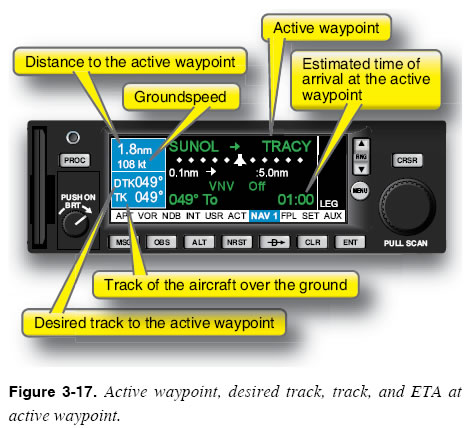 Desired Track The FMS/PFD/MFD navigation display also shows the desired track to the active waypoint. The desired track is the intended course for the active leg in the programmed flight plan. It is the track that connects the waypoint the aircraft just passed to the active waypoint. On the display in Figure 3-17, the current desired track is the 049-degree course between the SUNOL and TRACY waypoints. Track The navigation display shows the aircraft’s track over the ground. The track, which is the result of aircraft heading and winds, tells you which direction the aircraft is actually flying. Winds make it likely that the track and heading will be different. You can get a very good sense of what the winds are doing by comparing the track and heading of the aircraft. If the aircraft is flying a heading of 090 degrees and the track is 080 degrees, the winds are coming from the south. Notice that having a track indication makes it easy to maintain the desired track. To follow the 049-degree desired track to TRACY upon leaving SUNOL, simply fly the heading that results in a track of 049 degrees. The track display eliminates the traditional method of “bracketing” to find a heading that lets you fly the desired track. Groundspeed and ETA The display in Figure 3-17 also shows groundspeed. Again, the navigation display eliminates the need to calculate groundspeed using distance and time. Based on groundspeed and distance from the active waypoint, the navigation page also provides an estimated time of arrival at the active waypoint. Fuel Used and Time Remaining Many advanced avionics navigation units offer fuel calculations and fuel state monitoring. Some units automatically load the initial fuel load, while many require the pilot to correctly enter the amount of fuel into the unit as the beginning fuel on board. Some can have installed transducers (sensors) to measure the fuel used, and display fuel used and time remaining at the current consumption rate. Some lower cost units indicate computed fuel consumption values based on fuel burn rates entered by the pilot. This produces an estimate of fuel used and fuel remaining. This estimate is only as accurate as the values entered by the pilot for fuel on board and the consumption rate. Since the pilot is often using the AFM chart data, there is potential for interpretation error. Then, there is the variation error from the factory charts to the specific aircraft being flown. These factors all tend to degrade the accuracy of the fuel calculation based solely on pilot entered data. Other factors such as a fuel burn that is higher than normal, leaks, or other problems are not displayed unless the system actually registers and senses fuel tank realtime status. These errors can affect both types of systems. The pilot must determine what equipment is installed. Arriving at the Active Waypoint As the aircraft reaches the active waypoint, there are four new tasks for the pilot: (1) recognizing imminent arrival at the active waypoint; (2) leading the turn to avoid overshooting the course to the next waypoint; (3) making the next waypoint the new active waypoint; and (4) selecting the desired course to the new active waypoint. All FMS/RNAV computers offer a sequencing mode that greatly simplifies the performance of the first three of these tasks. Sequencing mode provides three services: waypoint alerting, turn anticipation, and waypoint sequencing. |
