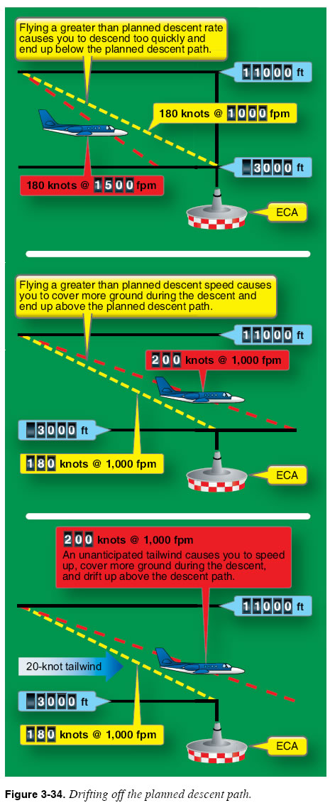 Common Error: Not Considering Winds During Descent Planning A common error in planning a descent is failing to consider winds and their effect on groundspeed. As illustrated in Figure 3-34, if you fail to take into account a 20-knot tailwind, your groundspeed will be faster than you planned, and you will reach the target waypoint before reaching the assigned altitude.
