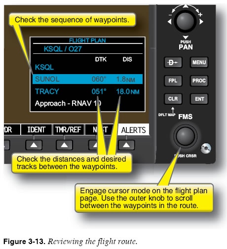 Risk: Taking Off Without Entering a Flight Plan The convenience of the FMS, especially the “direct to” feature common to all units, creates the temptation to program only the first en route waypoint prior to takeoff and then enter additional waypoints once airborne. Keep in mind, however, that no matter how skilled you become with the avionics, programming requires “heads down” time, which reduces your ability to scan for traffic, monitor engine instruments, etc. A better strategy is to enter all of the flight data before you take off. Reviewing the Flight Route Once a route has been entered into the FMS, the next step is to review the route to ensure it is the desired route. It is particularly important to ensure that the programmed route agrees with the pilot’s clearance, the en route and terminal area charts, and any bearing, distance, time, and fuel calculations that have been performed on paper. Catching Errors: Using the FMS Flight Planning Function To Cross-Check Calculations Using the FMS’s flight planning function to check your own flight planning calculations is one example of how advanced cockpit systems can decrease the likelihood of an error. Alternatively, cross-check the computer’s calculations against your own. (Remember the old computer programmer’s adage, “Garbage in, garbage out (GIGO).”) The flight planning page can also be used to review the route that you entered into the FMS, as illustrated in Figure 3-13. Be sure to check at least four things when reviewing your route.