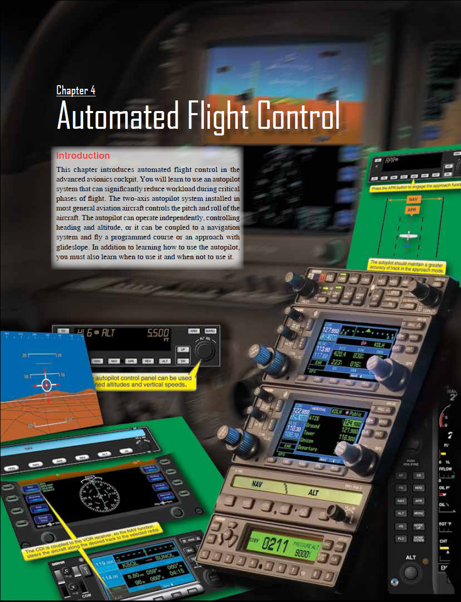 You will learn how the autopilot and the flight management system (FMS)/area navigation (RNAV) unit combine to create a fairly automated form of flight that places you in a managerial role. While the autopilot relieves you from manually manipulating the flight controls, you must maintain vigilance over the system to ensure that it performs the intended functions and the aircraft remains within acceptable parameters of altitudes, airspeeds, and airspace limits.