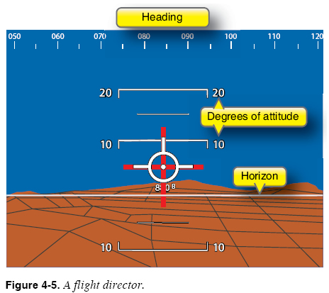 An FD is an extremely useful aid that displays cues to guide pilot or autopilot control inputs along a selected and computed flightpath. [Figure 4-5] The flight director usually receives input from an ADC and a flight data computer. The ADC supplies altitude, airspeed and temperature data, heading data from magnetic sources such as flux valves, heading selected on the HSI (or PFD/multi-function display (MFD)/ electronic horizontal situation indicator (EHSI)), navigation data from FMS, very high frequency omnidirectional range (VOR)/distance measuring equipment (DME), and RNAV sources. The flight data computer integrates all of the data such as speed, position, closure, drift, track, desired course, and altitude into a command signal.
