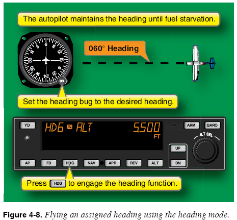 You should note that, when using the heading mode, the FD/ autopilot ignores the pilot-programmed route in the FMS or any VOR radials you set. When in heading mode, the FD/ autopilot will fly the selected heading until fuel starvation.