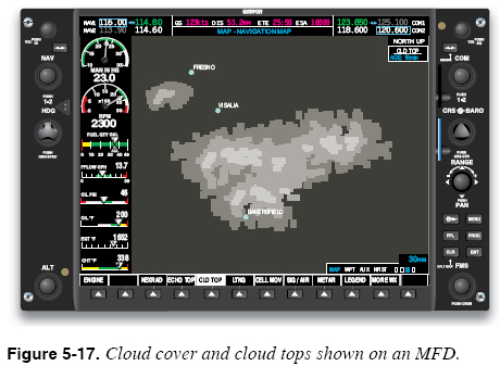Broadcast (or data link) weather services are also capable of transmitting lightning data to the cockpit. The symbology used to present lightning data derived from these sources is similar to that used by onboard lightning detection systems. The lightning data provided by ground weather surveillance systems is also a delayed weather product. Since the lightning data provided by a broadcast service is derived from multiple sensors, estimates of the range of electrical discharges are more accurate than those provided by onboard systems. Clouds Weather products that describe cloud coverage are generally available only from broadcast weather services. One popular broadcast weather service offers graphical displays of visible cloud cover along with the cloud top altitude as determined from satellite imagery. Figure 5-17 shows an MFD that depicts cloud cover and cloud tops.
