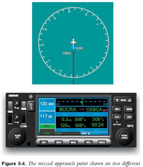 Identifying the Missed Approach Point The moving map display is an especially useful aid for recognizing arrival at various points, including the missed approach point during an instrument approach. The moving map display complements the distance readout on the PFD/ MFD/FMS. Figure 5-4 shows two indications of an aircraft arriving at a missed approach point. The position of the aircraft on the moving map is very clear, and the range setting has been used to provide a more detailed view of the missed approach waypoint.