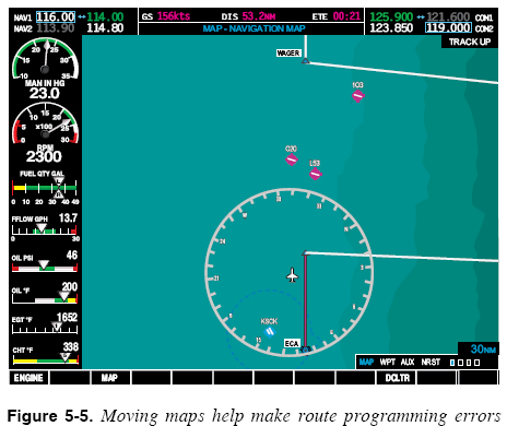 CAUTION: Some units can be set to change ranges automatically. In some instances, this can lead to a loss of situational awareness as you forget or miss a scale change. This can lead to sudden pilot realization at some point that the aircraft is too high, too far, or moving too fast. Manual switching (pilot selection) of the range display ensures that you are constantly aware of the distances and closure rates to points. Catching Errors: Using the Moving Map to Detect Route Programming Errors Moving maps are particularly useful for catching errors made while entering modifications to the programmed route during flight. Misspelled waypoints are often difficult to detect among a list of waypoints. The moving map in Figure 5-5 shows a route containing a misspelled waypoint. It is easy to detect the mistake when the information is shown pictorially. For this reason, a display such as a moving map is sometimes referred to as an error-evident display. The PFD selected track indicates incorrect settings. Always be ready and able to fly the aircraft according to any air traffic control (ATC) clearance or instructions. Disengaging all automation and then reestablishing heading, track, and altitude control is the pilot’s first priority at all times. Then, when the aircraft is on an assigned track at a safe altitude, pilot time can be expended to reprogram as necessary.