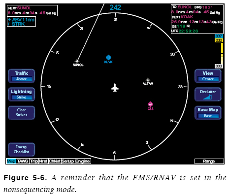 Catching Errors: Using The Moving Map To Detect Configuration Errors Moving maps can help you discover errors made in programming the FMS/RNAV and PFD. The moving map display shown in Figure 5-6 removes the depiction of the leg to the active waypoint when the FMS/RNAV is engaged in the nonsequencing mode. This feature provides an easy way to detect the common error of forgetting to set the computer back to the sequencing mode.