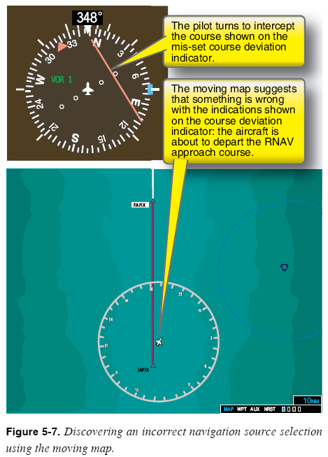 The moving map shown in Figure 5-7 allows you to discover a more serious programming error quickly. In this situation, the pilot is attempting an RNAV approach. However, the course deviation indicator (CDI) has erroneously been set to display very high frequency (VHF) omnidirectional range (VOR) course indications. The CDI suggests that the aircraft is well to the west of course. The moving map display shows the true situation—the aircraft is on the RNAV approach course, but is about to depart it.