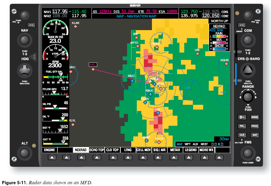 Risk: Flying in Close Proximity to Terrain A display that plainly shows your position with respect to surrounding terrain is sometimes cited as the most reassuring system available in the advanced avionics cockpit. The same display can also invite the unwary pilot to attempt risky maneuvers. Suppose that, on a VFR flight to an airport located in hilly terrain, you encounter a layer of fog at 1,100 feet. In an aircraft with no terrain system, you would not consider proceeding to the airport because you have a personal minimum of 1,500 feet. With a ceiling of less than 1,500 feet, you deem the situation simply too risky. With the surrounding terrain neatly displayed in front of you, however, you may feel more confident and be tempted to give it a try. However, a wise pilot remembers that, unless the equipment is TAWS certified, accuracy is suspect. Even with TAWS certification, the information presented is no better than the database accuracy. Consult the equipment handbook or manual to determine the accuracy of the database in that area. CFIT accidents are still occurring despite the advent of advanced avionics. What has happened here? Psychologist Gerald J. S. Wilde coined the phrase risk homeostasis to refer to a tendency for humans to seek target levels of risk. Our hill-flying scenario illustrates the concept. After pondering the perceived risks, you decide that having the terrain display gives you the same level of perceived risk with a 1,000-foot ceiling as you felt you had at 1,500 feet without the terrain display. You see no need to “give away” this new margin of perceived safety. Rather, you decide to use it to your advantage. Equipped with the terrain display, your new minimum ceiling becomes 1,000 feet, and you continue on your way to the airport. Wilde does not support the idea of using technology to seek target levels of risk. Rather, he argues that safety measures such as seat belt laws and anti-lock brakes have not resulted in drastic reductions in highway fatalities in part because, in response to the added sense of safety provided by these measures, drivers have emboldened their driving behavior to maintain existing levels of risk. Another issue is the lack of training in the new equipment and its uses. The functions of TAWS and basically how it works have been previously described, yet there is no training program outside the military that teaches anyone to fly based on the TAWS display. It requires much precision flight training to learn the timing and skills to fly from a display depicting a myriad of data and converting that data into close and low terrain flight directions. All advanced avionics are designed to help the pilot avoid a hazard, not enable the pilot to get closer to it. TAWS is not a terrain flight following system. Cockpit Weather Systems Advanced avionics cockpit weather systems provide many of the same weather products available on the ground and have a variety of uses that can enhance awareness of weather that may be encountered during almost any phase of flight. Radar images, satellite weather pictures, Aviation Routine Weather Reports (METARs), terminal weather forecasts (TAFs), significant meteorological information (SIGMETs), Airmen’s Meteorological Information (AIRMETs), and other products are now readily accessible at any time during flight. Weather products provided by cockpit weather systems are typically presented on an MFD. Some installations allow the overlay of this data in the PFD. You must learn the procedures required to show each kind of weather product on the MFD and/or PFD, and how to interpret each type of weather product. Know the limitations of each type of product, and the ways in which cockpit weather systems can be used to gather information and remain clear of weather hazards throughout the flight. Thunderstorms and Precipitation Thunderstorms and general areas of precipitation are detected through the use of radar. In the advanced avionics cockpit, radar data can come from one of two sources: an onboard weather radar system or a ground weather surveillance radar system, such as the Next Generation Radar (NEXRAD) system. Ground weather surveillance system data is transmitted to the cockpit via a broadcast (or datalink) weather service. Onboard weather radar and ground weather surveillance radar systems each offer advantages and disadvantages to the pilot. Some aircraft use a combination of both systems. While onboard radar is real time, many downloaded radar images and other reports are delayed for some time period for various reasons. Given the nature of thunderstorms and other weather hazards, this delay could prove hazardous. You must know the true quality and age of the data. Most MFDs are capable of presenting radar data together with aircraft position and the programmed route, as shown in Figure 5-11.