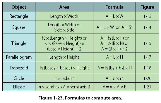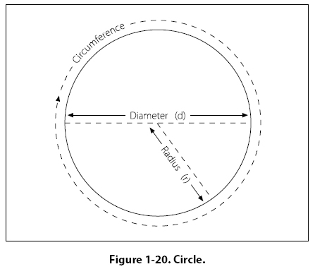 Circle A circle is a closed, curved, plane figure. [Figure 1-20] Every point on the circle is an equal distance from the center of the circle. The diameter is the distance across the circle (through the center). The radius is the distance from the center to the edge of the circle. The diameter is always twice the length of the radius. The circumference, or distance around, a circle is equal to the diameter times π. Circumference = C = dp The formula for the area of a circle is: Area = π x radius2 = π x r2 Example: The bore, or “inside diameter," of a certain aircraft engine cylinder is 5 inches. Find the area of the cross section of the cylinder.