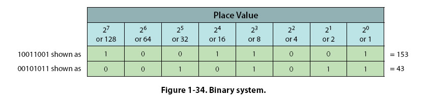 To convert inches to millimeters, multiply the number of inches by 25.4. Example: 20 inches = 20 x 25.4 = 508 mm To convert ounces to grams, multiply the number of ounces by 28.35. Example: 12 ounces = 12 x 28.35 = 340.2 grams The Binary Number System The binary number system has only two digits: 0 and 1. The prefix in the word “binary" is a Latin root for the word “two" and its use was first published in the late 1700s. The use of the binary number system is based on the fact that switches or valves have two states: open or closed (on/off). Currently, one of the primary uses of the binary number system is in computer applications. Information is stored as a series of 0s and 1s, forming strings of binary numbers. An early electronic computer, ENIAC (Electronic Numerical Integrator And Calculator), was built in 1946 at the University of Pennsylvania and contained 17,000 vacuum tubes, along with 70,000 resistors, 10,000 capacitors, 1,500 relays, 6,000 manual switches and 5 million soldered joints. Computers obviously have changed a great deal since then, but are still based on the same binary number system. The binary number system is also useful when working with digital electronics because the two basic conditions of electricity, on and off, can be represented by the two digits of the binary number system. When the system is on, it is represented by the digit 1, and when it is off, it is represented by the digit zero. Place Values The binary number system is a base-2 system. That is, the place values in the binary number system are based on powers of 2. An 8-bit binary number system is shown in Figure 1-34 on the next page.
