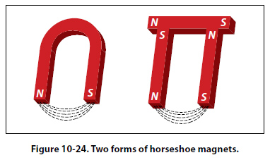 Types of Magnets Magnets are either natural or artificial. Since naturally occurring magnets or lodestones have no practical use, all magnets considered in this study are artificial or manmade. Artificial magnets can be further classified as permanent magnets, which retain their magnetism long after the magnetizing force has been removed, and temporary magnets, which quickly lose most of their magnetism when the external magnetizing force is removed. Modern permanent magnets are made of special alloys that have been found through research to create increasingly better magnets. The most common categories of magnet materials are made out of Aluminum-Nickel- Cobalt (Alnicos), Strontium-Iron (Ferrites, also known as Ceramics), Neodymium-Iron-Boron (Neo magnets), and Samarium-Cobalt. Alnico, an alloy of iron, aluminum, nickel and cobalt, and is considered one of the very best. Others with excellent magnetic qualities are alloys such as Remalloy™ and Permendur™. The ability of a magnet to hold its magnetism varies greatly with the type of metal and is known as retentivity. Magnets made of soft iron are very easily magnetized but quickly lose most of their magnetism when the external magnetizing force is removed. The small amount of magnetism remaining, called residual magnetism, is of great importance in such electrical applications as generator operation. Horseshoe magnets are commonly manufactured in two forms. [Figure 10-24] The most common type is made from a long bar curved into a horseshoe shape, while a variation of this type consists of two bars connected by a third bar, or yoke.