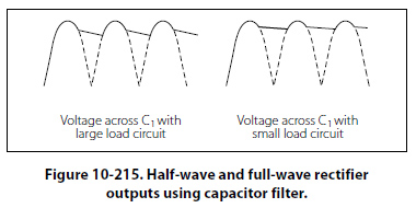 The capacitor C1 is chosen to offer very low impedance to the AC ripple frequency and very high impedance to the DC component. The ripple voltage is therefore bypassed to ground through the low impedance path of the capacitor, while the DC voltage is applied unchanged to the load. The effect of the capacitor on the output of the rectifier can be seen in the waveshapes shown in Figure 10-215. Dotted lines show the rectifier output, while the solid lines show the effect of the capacitor. In this example, full-wave rectifier outputs are shown. The capacitor C1 charges when the rectifier voltage output tends to increase and discharges when the voltage output tends to decrease. In this manner, the voltage across the load R1 is kept fairly constant.