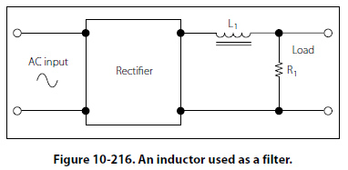The inductance provided by an inductor may be used as a filter, because it opposes a change in current through it by storing energy in its electromagnetic field. Whenever the current increases, the stored energy in the electromagnetic field increases. When the current through the inductor decreases, the inductor supplies the energy back into the circuit in order to maintain the existing flow of current. The use of an inductor for filtering the output of a rectifier is shown in Figure 10-216. Note that in this network the inductor L1 is in series with the load R1.