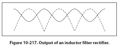 The inductance L1 is selected to offer high impedance to the AC ripple voltage and low impedance to the DC component. The result is a very large voltage drop across the inductor and a very small voltage drop across the load R1. For the DC component, however, a very small voltage drop occurs across the inductor and a very large voltage drop across the load. The effect of an inductor on the output of a full-wave rectifier in the output waveshape is shown in Figure 10-217.