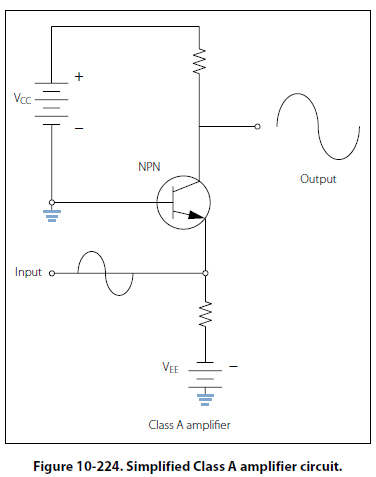 Figure 10-224, shows a simplified Class A amplifier circuit. In the Class A operation, the current in the transistor flows for 100 percent or 360° of the input signal. Class A operation is the least efficient class of operation but provides the best fidelity. Fidelity simply means that the output signal is a good reproduction of the input signal in all respects other than the amplitude,