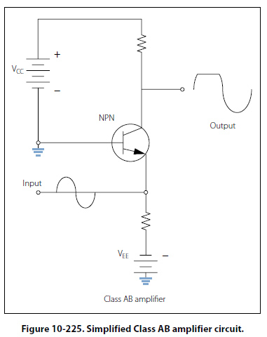 Figure 10-225, shows a simplified Class AB amplifier circuit. In the Class AB operation, the transistor current flows for more than 50 percent but less than 100 percent of the input signal. Unlike the Class A amplifier, the output signal is distorted. A portion of the output circuit appears to be truncated. This is due to the lack of current through the transistor during this point of operation. When the emitter in this case becomes positive enough, the transistor cannot conduct because the
