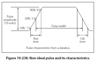composed of two edges — one being the leading edge and the other the trailing edge. In the case of the positive pulse logic, the positive transition from a lower state to a higher state is the leading edge and the trailing edge is the opposite. In the case of the negative logic pulse, the negative transition from a higher state to a lower state is the leading edge while the rise from the lower state back to the higher state is the trailing edge. Figure 10-237 is considered an ideal pulse because the rise and fall times are instantaneous. In reality, these changes take time, although in actual practice, the rise and fall can be assumed as instantaneous. Figure 10-238 shows the non-ideal pulse and its characteristics. The time required for a pulse to go from a low state to a high state is called the rise time, and the time required for the pulse to return to zero is called the fall time. It is common practice to measure the rise and fall time between 10 percent amplitude and 90 percent amplitude. The reason for taking the measurements in these points is due to the non-linear shape of the pulse in the first 10 percent and final 90 percent of the rise and fall amplitudes. The pulse width is defined as the duration of the pulse. To be more specific, it is the time between the 50 percent amplitude point on both the pulse rise and fall.