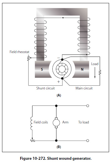Shunt Wound DC Generators A generator having a field winding connected in parallel with the external circuit is called a shunt generator, as shown in views A and B of Figure 10-272. The field coils of a shunt generator contain many turns of small wire; the magnetic strength is derived from the large number of turns rather than the current strength through the coils. If a constant voltage is desired, the shunt wound generator is not suitable for rapidly fluctuating loads. Any increase in load causes a decrease in the terminal or output voltage, and any decrease in load causes an increase in terminal voltage; since the armature and the load are connected in series, all current flowing in the external circuit passes through the armature winding. Because of the resistance in the armature winding, there is a voltage drop (IR drop = current × resistance). As the load increases, the armature current increases and the IR drop in the armature increases. The voltage delivered to the terminals is the difference between the induced voltage and the voltage drop; therefore, there is a decrease in terminal voltage. This decrease in voltage causes a decrease in field strength, because the current in the field coils decreases in proportion to the decrease in terminal voltage; with a weaker field, the voltage is further decreased. When the load decreases, the output voltage increases accordingly, and a larger current flows in the windings. This action is cumulative, so the output voltage continues to rise to a point called field saturation, after which there is no further increase in output voltage.