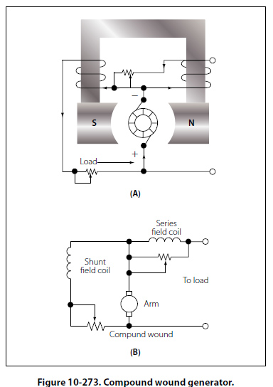 The terminal voltage of a shunt generator can be controlled by means of a rheostat inserted in series with the field windings as shown in Figure 10-272A. As the resistance is increased, the field current is reduced; consequently, the generated voltage is reduced also. For a given setting of the field rheostat, the terminal voltage at the armature brushes will be approximately equal to the generated voltage minus the IR drop produced by the load current in the armature; thus, the voltage at the terminals of the generator will drop as the load is applied. Certain voltage sensitive devices are available which automatically adjust the field rheostat to compensate for variations in load. When these devices are used, the terminal voltage remains essentially constant. Compound Wound DC Generators A compound wound generator combines a series winding and a shunt winding in such a way that the characteristics of each are used to advantage. The series field coils are made of a relatively small number of turns of large copper conductor, either circular or rectangular in cross section, and are connected in series with the armature circuit. These coils are mounted on the same poles on which the shunt field coils are mounted and, therefore, contribute a magnetomotive force which influences the main field flux of the generator. A diagrammatic and a schematic illustration of a compound wound generator is shown in A and B of Figure 10-273.