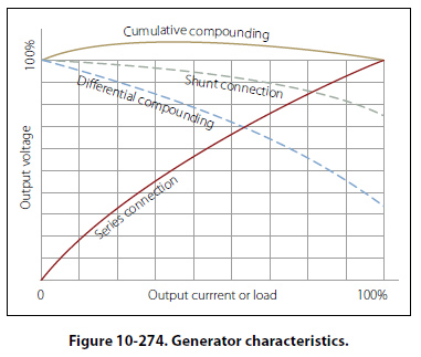 If the ampere turns of the series field act in the same direction as those of the shunt field, the combined magnetomotive force is equal to the sum of the series and shunt field components. Load is added to a compound generator in the same manner in which load is added to a shunt generator, by increasing the number of parallel paths across the generator terminals. Thus, the decrease in total load resistance with added load is accompanied by an increase in armature circuit and series field circuit current. The effect of the additive series field is that of increased field flux with increased load. The extent of the increased field flux depends on the degree of saturation of the field as determined by the shunt field current. Thus, the terminal voltage of the generator may increase or decrease with load, depending on the influence of the series field coils. This influence is referred to as the degree of compounding. A flat compound generator is one in which the no load and full load voltages have the same value; whereas an under compound generator has a full load voltage less than the no load value, and an over compound generator has a full load voltage which is higher than the no load value. Changes in terminal voltage with increasing load depend upon the degree of compounding. If the series field aids the shunt field, the generator is said to be cumulative compounded. If the series field opposes the shunt field, the machine is said to be differentially compounded, or is called a differential generator. Compound generators are usually designed to be overcompounded. This feature permits varied degrees of compounding by connecting a variable shunt across the series field. Such a shunt is sometimes called a diverter. Compound generators are used where voltage regulation is of prime importance. Differential generators have somewhat the same characteristics as series generators in that they are essentially constant current generators. However, they generate rated voltage at no load, the voltage dropping materially as the load current increases. Constant current generators are ideally suited as power sources for electric arc welders and are used almost universally in electric arc welding. If the shunt field of a compound generator is connected across both the armature and the series field, it is known as a long shunt connection, but if the shunt field is connected across the armature alone, it is called a short shunt connection. These connections produce essentially the same generator characteristics. A summary of the characteristics of the various types of generators discussed is shown graphically in Figure 10-274.