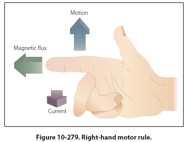 develop which pushes side B downward. At the same time, the field of the magnets and the field about A, in which the current is inward, will add at the bottom and subtract at the top. Therefore, A will move upward. The coil will thus rotate until its plane is perpendicular to the magnetic lines between the north and south poles of the magnet, as indicated in Figure 10-278 by the white coil at right angles to the black coil. The tendency of a force to produce rotation is called torque. When the steering wheel of a car is turned, torque is applied. The engine of an airplane gives torque to the propeller. Torque is developed also by the reacting magnetic fields about the current carrying coil just described. This is the torque, which turns the coil. The right-hand motor rule can be used to determine the direction a current carrying wire will move in a magnetic field. As illustrated in Figure 10-279, if the index finger of the right hand is pointed in the direction of the magnetic field and the second finger in the direction of current flow, the thumb will indicate the direction the current carrying wire will move.