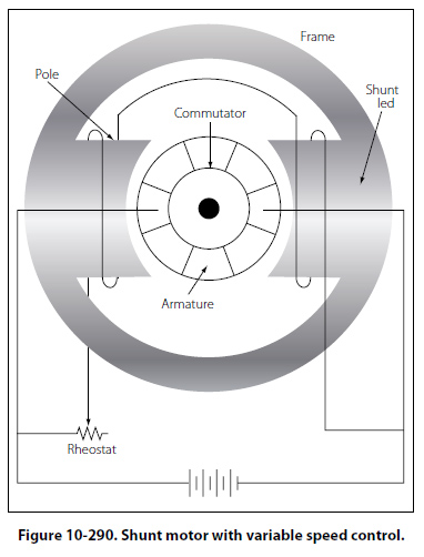 In the shunt motor, speed is controlled by a rheostat in series with the field windings. [Figure 10-290] The speed depends on the amount of current that flows through the rheostat to the field windings. To increase the motor speed, the resistance in the rheostat is increased, which decreases the field current. As a result,