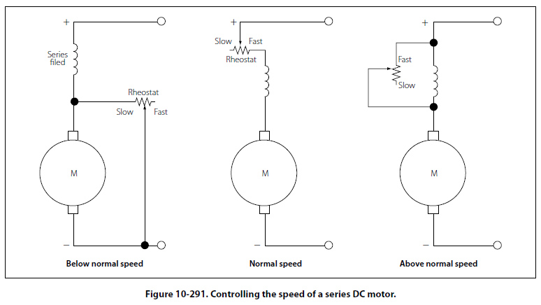 In the series motor, the rheostat speed control is connected either in parallel or in series with the motor field, or in parallel with the armature. When the rheostat is set for maximum resistance, the motor speed is increased in the parallel armature connection by a decrease in current. When the rheostat resistance is maximum in the series connection, motor speed is reduced by a reduction in voltage across the motor. For above normal speed operation, the rheostat is in parallel with the series field. Part of the series field current is bypassed and the motor speeds up. [Figure 10-291]