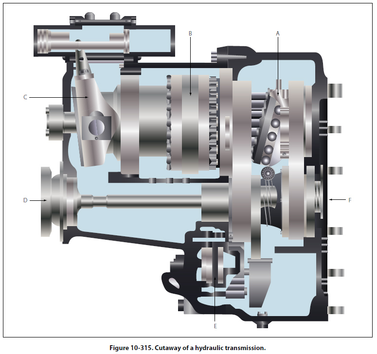 The transmission is mounted between the generator and the aircraft engine. Its name denotes that hydraulic oil is used, although some transmissions may use engine oil. Refer to the cutaway view of such a transmission in Figure 10-315. The input shaft D is driven from the drive shaft on the accessory section of the engine. The output drive F, on the opposite end of the transmission, engages the drive shaft of the generator.