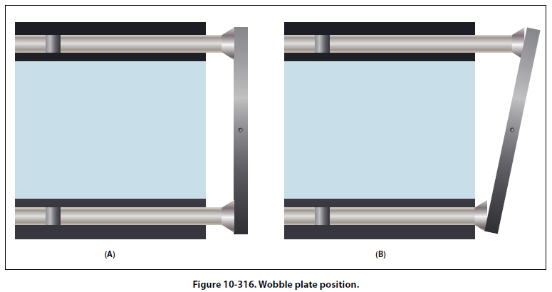 If the plate remained as shown in Figure 10-316A, each of the 14 cylinders would have equal pressure, and all pistons would be in the same relative position in their respective cylinders. But with the plate tilted, the top portion moves outward and the lower portion inward, as shown in Figure 10-316B. As a result, more oil enters the interior of the upper cylinder, but oil will be forced from the cylinder of the bottom piston.