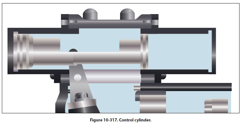 The center of the system’s hydraulic cylinder is slotted so the arm of the pump wobble plate can be connected to the piston. As oil pressure moves the piston, the pump wobble plate is placed in either overspeed, underspeed, or straight drive.