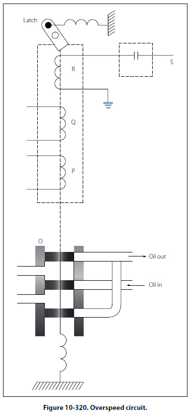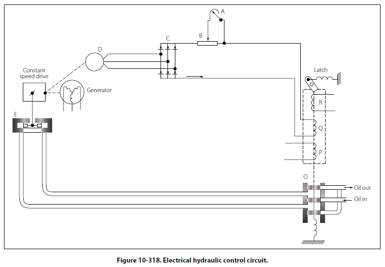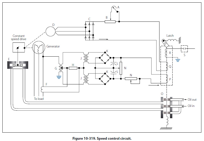 Note, then, in Figure 10-318, that the circuit has a valve and solenoid assembly O and a control cylinder E, and that it contains such units as the tachometer generator D, the rectifier C, and adjustable resistor B, rheostat A, and the control coil Q.