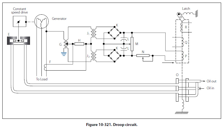 There are still two important circuits, which must be discussed: the overspeed circuit and the load division circuit. The generator is prevented from overspeeding by a centrifugal switch (S in Figure 10-320) and the overspeed solenoid coil R, which is located in the solenoid and valve assembly. The centrifugal switch is on the transmission and is driven through the same gear arrangement as the tach generator.