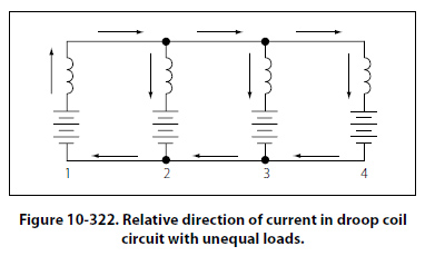 As shown in Figure 10-322, current through No. 1 control coil, where the largest load exists, aids the control coil of the valve and solenoid, thereby slowing down the generator. (The source voltage of the control coils is represented by battery symbols in the illustration.) The current in the remaining control coils opposes the control coil of the valve and solenoid, in order to increase the speed of the other generators so the load will be more evenly distributed.