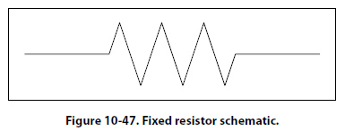Figure 10-47 is a schematic representation of a fixed resistor. Fixed resistors have built into the design a means of opposing current. The general use of a resistor in a circuit is to limit the amount of current flow. There are a number of methods used in construction and sizing of a resistor that control properties such as resistance value, the precision of the resistance value, and the ability to dissipate heat. While in some applications the purpose of the resistive element is used to generate heat, such as in propeller anti-ice boots, heat typically is the unwanted loss of energy.