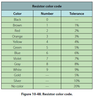 The resistor color code is made up of a group of colors, numbers, and tolerance values. Each color is represented by a number, and in most cases, by a tolerance value. [Figure 10-48]